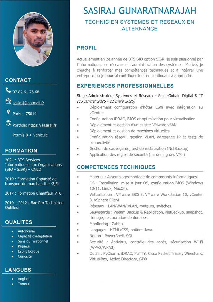 Durant cette expérience, j'ai participé activement au déploiement et à la configuration d’hôtes ESXi, à l’intégration d’infrastructures au vCenter, ainsi qu'à la gestion d’un cluster VMware vSAN. Ce stage m'a permis de développer mes compétences en virtualisation, gestion de systèmes et administration d'infrastructures IT dans un environnement exigeant, innovant et international.